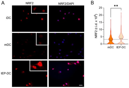 Effect of EP on NRF2 activation in DCs. BMDCs were obtained from C57BL/6 mice and differentiated towards DCs in the presence of GM-CSF (20 ng/mL). Cells were stimulated with LPS (100 ng/mL) for 2 h without previous EP treatment (mDCs) or previously treated with 3.1 mM EP (tEP-DCs). Immunocytochemistry was used to stain cells with an antibody against NRF2 (red) and with DAPI nuclear stain to visualize the nucleus (blue). Representative micrographs with insets (twice enlarged) are shown (A). The scale bar is 50 µm (white line). The results obtained in two experiments are presented as a violin plot (n = 150); the dashed line represents the level obtained in iDCs (B). r.i.d.—raw integrated density; ** p < 0.01, t-test.