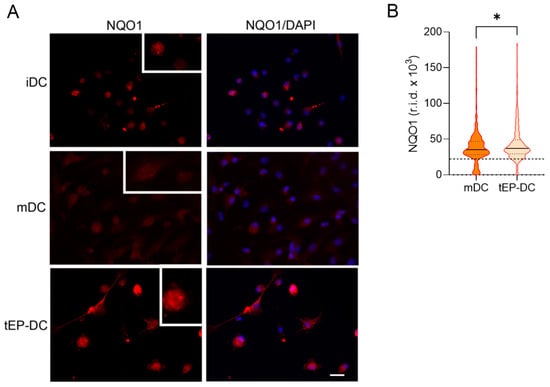 Effect of EP on NQO1 activation in DCs. BMDCs were obtained from C57BL/6 mice and differentiated towards DCs in the presence of GM-CSF (20 ng/mL). Cells were stimulated with LPS (100 ng/mL) for 2 h without previous EP treatment (mDCs) or previously treated with 3.1 mM EP (tEP-DCs). (A) Immunocytochemistry was used to stain cells with an antibody against NQO1 (red) and with DAPI nuclear stain to visualize the nucleus (blue). Representative micrographs with insets (twice enlarged) are shown (A). The scale bar is 20 µm (white line). The results obtained in three experiments are presented as a violin plot (n = 300); the dashed line represents the level obtained in iDCs (B). r.i.d.—raw integrated density; * p < 0.05, t-test.