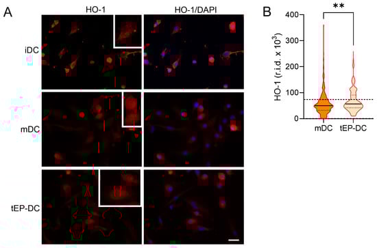 Effect of EP on HO-1 activation in DCs. BMDCs were obtained from C57BL/6 mice and differentiated towards DCs in the presence of GM-CSF (20 ng/mL). Cells were stimulated with LPS (100 ng/mL) for 2 h without previous EP treatment (mDCs) or previously treated with 3.1 mM EP (tEP-DCs). (A) Immunocytochemistry was used to stain cells with an antibody against HO-1 (red) and with DAPI nuclear stain to visualize the nucleus (blue). Representative micrographs with insets (twice enlarged) are shown (A). The scale bar is 20 µm (white line). The results obtained in three experiments are presented as a violin plot (n = 300); the dashed line represents the level obtained in iDCs (B). r.i.d.—raw integrated density; ** p < 0.01, t-test.