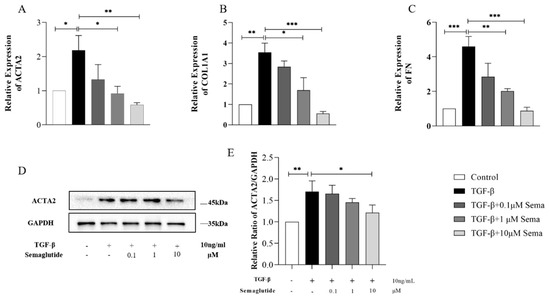 RT-qPCR analysis of the relative mRNA expression levels of ACTA2 (A), COL1A1 (B), and FN (C) in TGF-β-induced HEECs treated with or without Semaglutide. Western blot analysis of the protein expression level of ACTA2 (D,E) in TGF-β-induced HEECs treated with or without Semaglutide. Data are expressed as mean ± SD. * p < 0.05, ** p < 0.01, and *** p < 0.001.