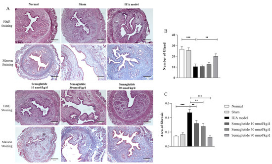 The 36 mice were evenly divided into six groups: a normal control group (normal, n = 6), a sham operation group (sham, n = 6), an IUA + double-distilled H2O (H2O) group (model, n = 6), an IUA + 10 nmol/kg Semaglutide group (n = 6), an IUA + 30 nmol/kg Semaglutide group (n = 6), and an IUA + 90 nmol/kg Semaglutide group (n = 6). Semaglutide was subcutaneously injected into the mice once a day for two weeks, while the control and sham-operated mice received equal amounts of sterile ddH2O. After 14 days of treatment, each mouse was sacrificed with an overdose of 4% chloral hydrate, and their uteri and blood were harvested.
