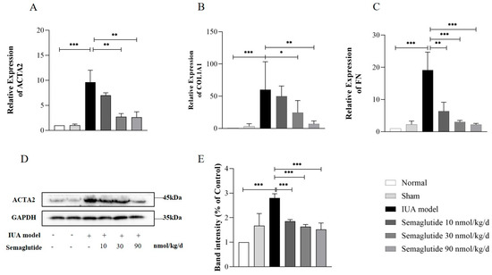 RT-qPCR analysis of the relative mRNA expression levels of ACTA2 (A), COL1A1 (B), and FN (C) in the uteri of mice in each group. Western blot analysis of the protein expression level of ACTA2 in the uteri of mice in each group (D,E). Data are expressed as mean ± SD. * p < 0.05, ** p < 0.01, and *** p < 0.001.
