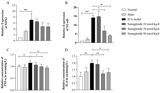 RT-qPCR analysis of the relative mRNA expression levels of NOX2 (A) and NF-κB (B) in the uteri of mice in each group. ELISA analysis of the serum levels of TNF-α (C) and IL-6 (D) in mice in each group. Data are expressed as mean ± SD. * p < 0.05, ** p < 0.01, and *** p < 0.001.