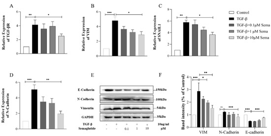 Compared with the control group, the mRNA expression levels of TGF-βR, SNAIL1, VIM, and N-Cadherin in TGF-β-induced HEECs increased significantly (p < 0.05). Except for TGF-βR, the expression levels of the other three indicators were reduced after the intervention of Semaglutide, and there was a significant difference at the highest concentration of 90 nmol/kg/d (p < 0.05) (Figure 7A–D). Western Blot showed that with Semaglutide intervention, the protein expression of VIM (p = 0.0048) and N-Cad (p = 0.0476) were significantly reduced, and E-Cad increased (p = 0.0221) in TGF-β-induced HEECs (Figure 7E,F), further suggesting that Semaglutide has an inhibitory effect on EMT in TGF-β-induced HEECs.