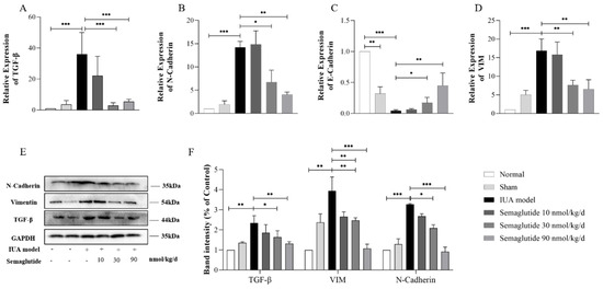 RT-qPCR analysis of the relative mRNA expression levels of TGF-β (A), N-Cadherin (B), E-Cadherin (C), and vimentin (D) in the uteri of mice in each group. Western blot analysis of the protein expression level of TGF-β, vimentin, and TGF-β in the uteri of mice in each group (E,F). Data are expressed as mean ± SD. * p < 0.05, ** p < 0.01, and *** p < 0.001.