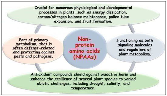 The Impact of amino acids and their derivatives on plant responses to both biotic and abiotic stress is discussed in a comprehensive review by Cai and Aharoni (2022) []. Plant organisms contain alpha-, beta-, and gamma-aminobutyric acids, among other non-protein amino acids. Their endogenous presence and quantitative increase can be linked to abiotic and biotic stress effects.