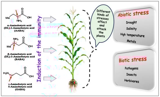 The examination of various protective natural compounds made by plants in response to stress led to the testing of the external, synthetic application possibilities of these compounds [,,,,,]. The effectiveness of the exogenous application of these compounds has already been confirmed by several reports [,,,]. The present review considered recent studies that investigated the impacts of externally administered non-protein amino acids (AABA, BABA, and GABA). Researchers have utilized these acids as initiators to counteract the negative impacts of abiotic and biotic stress. By doing so, we can help in structuring the explanation of the priming mechanisms and assessing the efficacy of individual NPAAs during their evaluation (Figure 1).