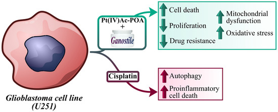 An important alteration in the redox balance dictated by the use of the supplement was confirmed by observations in transmission electron microscopy. In fact, if the samples subjected to chemotherapeutic drugs alone mainly showed signs of death via autophagy, those subjected to mycotherapy or combined treatment showed signs correlated with a form of regulated necrotic cell death, such as ferroptosis and necroptosis. Therefore, if the platinum-compound alone seems to trigger autophagy and apoptosis, the combined effects of chemotherapeutic drug + Ganostile induced ferroptotic and necroptotic pathway activation. Overall, we hypothesize that the combined use of Pt(IV)Ac-POA + Ganostile could therefore induce synergic effects on U251 cell line, improving the antiproliferative/cytotoxic effect mediated by chemotherapeutic treatment alone. While the role of the autophagic pathway is still debated, as the boundary between resistance to oncotherapy-induced damage and activation of an effective cell death mechanism seems thin, recent studies highlighted the fundamental role of ferroptotic and necroptotic signaling in cancer therapy. Indeed, the induction of nonapoptotic regulated cell death emerged as a new efficient strategy not only for the induction of death in cancer cells but also for the promotion of antitumor immunity [41,42].