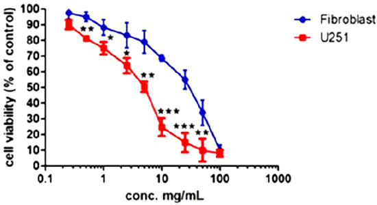 MTS viability assay. The cytotoxicity of the Ganostile was evaluated in cultured U251 and primary human fibroblast cells, concentrations from 0.25 to 100 mg/mL were used for 48hr. Cell viability was compared to untreated controls, cultured in the presence of the only basic growing medium. The experiments were performed two times with three technical replicates for each treatment. Data are expressed as mean ± SD referring to the control. p value: (*) < 0.05; (**) < 0.01 and (***) < 0.001.