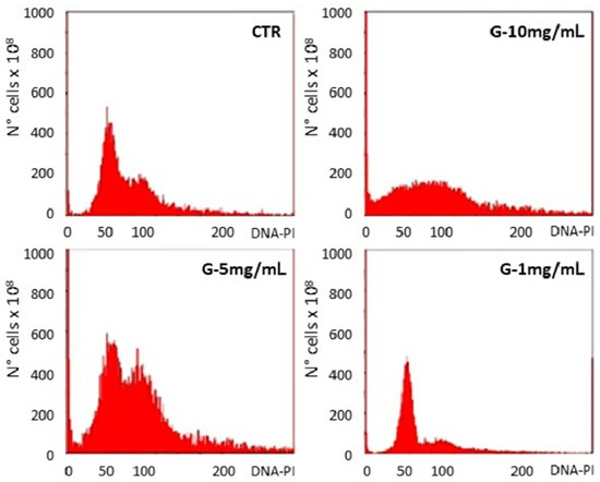 Compared to the control, in which 63.01% of the cells were found in the G1 phase, 14.06% in M phase, and 22.93% in G2 phase, at the concentration of 10 mg/mL, the cells no longer showed a normal distribution in the various phases of the cycle but there was a complete alteration in the cell cycle (G1 phase 34.71%, M phase 31.33%, and G2 phase 33.96). In contrast, no major changes were given by the usage of Ganostile 1 mg/mL; indeed, a pattern of cell distribution very similar to the control was notable (G1 phase 72.65%, M phase 12.70%, and G2 phase 14.65), meaning that, at this concentration, cells were not damaged considerably.