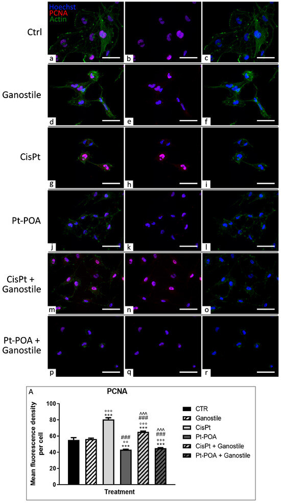 The treatments with Cisplatin alone (g–i) and in combination with Ganostile (m–o) showed a rise in PCNA levels (80.35 ± 7.31 and 65.29 ± 2.49, respectively). In contrast, a reduction in PCNA immunofluorescence OD was observed after the administration of Pt(IV)Ac-POA (j–l) and its combination (p–r) (43.19 ± 1.48 and 44.99 ± 2.04 for Pt(IV)Ac-POA and Ganostile + Pt(IV)Ac-POA, respectively). Moreover, treatments with Pt(IV)Ac-POA lead to a significant immunopositive decrease in the investigated proliferative marker compared to the control, as demonstrated by the presence of several PCNA immunonegative nuclei (k,q). Furthermore, cellular cytoskeleton and nuclear structures completely lost their physiological organization, i.e., several cells showed (i) pycnotic nuclei, characterized by dense and fragmented chromatin, and (ii) aggregated fluorescence spots of actin.