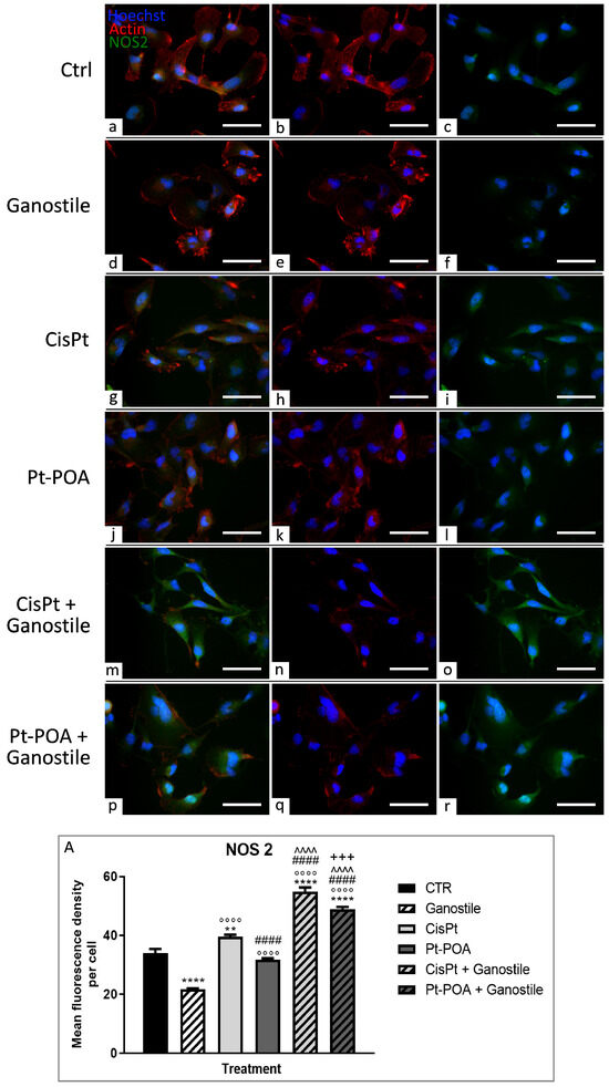 Double immunolabeling for NOS (in green) and actin (in red) in controls (a–c) and differently treated U251 cells, i.e., after 48hr-CT using Ganostile 5 mg/mL (d–f), Cisplatin 40 μM (g–i), Pt(IV)Ac-POA 10 μM (j–l), Cisplatin + Ganostile (m–o), or Pt(IV)Ac-POA + Ganostile (p–r). DNA was stained with Hoechst 33258 (blue fluorescence). Magnification 40×; scale bar: 50 μm. (Panel A) Histogram showing the NOS2 mean fluorescence intensity per cell (OD) in control and differently treated cells. * control vs. each experimental condition; ° Ganostile vs. other treatments; # Cisplatin vs. any combined treatment; ^ Pt(IV)Ac-POA vs. each combined treatment; + Cisplatin + Ganostile vs. other experimental groups.