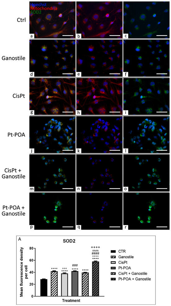 In particular, in the control (a–c) group, SOD2 (Figure 6) appeared expressed at the cytoplasmic level, strongly overlapping with mitochondria (28.51 ± 1.22). Following treatment with Ganostile (d–f) supplement, greater homogeneity in the cytosolic distribution of SOD2 (41.84 ± 1.85) and a reduction in mitochondria size were highlighted. Similarly to Ganostile-treated cells, after Cisplatin (g–i), Pt(IV)Ac-POA (j–l), or Cisplatin + Ganostile (m–o) treatment, an increase in SOD2 immunopositive OD was observed (38.26 ± 2.32, 41.89 ± 1.55 and 39.57 ± 1.30 for Cisplatin, Pt(IV)Ac-POA, and Cisplatin + Ganostile, respectively), partially colocalized with the residual mitochondria. Moreover, in the samples exposed to Pt(IV)Ac-POA + Ganostile (p–r), it was possible to note an extremely significant increase in SOD2 immunopositivity (58.00 ± 2.70), strongly detectable also at the nuclear level (Figure 6, Panel A).