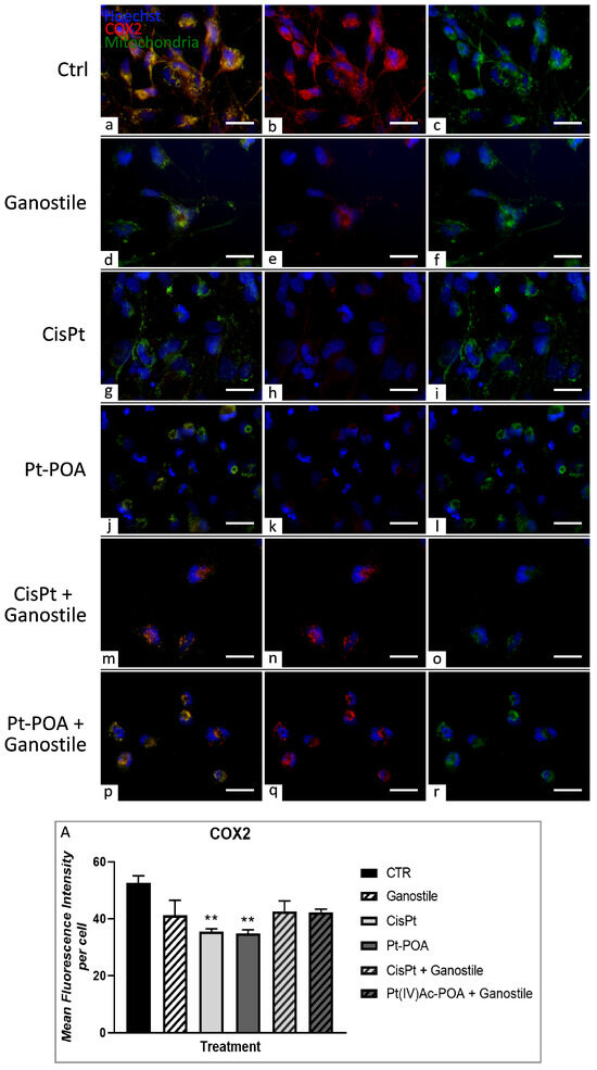 Figure 7 shows the double-immunofluorescent reaction for COX2 and mitochondria. In the control group (a–c), COX2 immunolabeling was clearly detectable in all cells and completely colocalized with mitochondria (52.61 ± 2.50). After Ganostile (d–f), a reduction in COX2 OD was observed (41.18 ± 5.37), accompanied by a slight decrease in colocalization with mitochondria, compared to the control. This immunolabeling pattern is maintained even when mycotherapy is used in combination with the two different platinum drugs (m–o and p–r) (42.62 ± 3.64 and 42.32 ± 1.03 for Cispaltin 40 μM + Ganostile 5 mg/mL and Pt(IV)Ac-POA 10 μM + Ganostile, respectively). However, a very significant reduction in COX2 OD was observed after Cisplatin (g–i) or Pt(IV)Ac-POA (j–l) treatment (35.50 ± 0.99 and 34.89 ± 1.21 for Cisplatin and Pt(IV)Ac-POA, respectively), with a concomitant evident reduction in colocalization with mitochondria, compared to the control group (Figure 7, panel A).