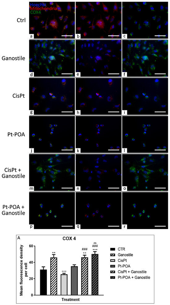 Double immunolabeling for COX4 (in green) and mitochondria (in red) in controls (a–c) and differently treated U251 cells, i.e., after 48hr-CT using Ganostile 5 mg/mL (d–f), Cisplatin 40 μM (g–i), Pt(IV)Ac-POA 10 μM (j–l), Cisplatin + Ganostile (m–o), or Pt(IV)Ac-POA + Ganostile (p–r). DNA was stained with Hoechst 33258 (blue fluorescence). Magnification 40×; scale bar: 50 μm. (Panel A) Histogram showing the COX4 mean fluorescence intensity per cell (OD) in control and differently treated cells. * control vs. each experimental condition; # Cisplatin vs. any combined treatment; ^ Pt(IV)Ac-POA vs. each combined treatment. ° Ganostile vs. other treatments.