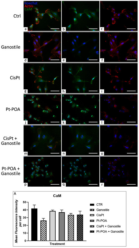 Possible activation/modification of the calcium pathway was evaluated by analyzing the changes in the expression levels of calmodulin (CaM), one of the main molecules involved in the regulation of cytoplasmatic concentration of calcium, after treatments. Figure 9 reported the double immunofluorescence staining for CaM and actin. In control (a–c) cells, CaM appeared homogeneously distributed in whole cytoplasm. Differently, treatment with Pt(IV)Ac-POA (j–l) leads to an evident agglomeration of CaM immunolabeling at the perinuclear level. Moreover, the quantitative analyses of OD revealed a slight reduction in CaM immunopositivity compared to the control (41.82 ± 4.56), already visible after Ganostile (d–f) (26.38 ± 2.66) alone and detectable in all treated groups (g–i, j–l, m–o, and p–r, 38.55 ± 1.25, 36.95 ± 2.93, 33.58 ± 1.95, and 33.88 ± 4.53 for Cisplatin 40 μM, Pt(IV)Ac-POA 10 μM, Cisplatin + Ganostile, and Pt(IV)Ac-POA + Ganostile, respectively), suggesting a possible modulation of the calcium pathway, already visible after Ganostile treatment but evident also after exposure to different platinum compounds, alone or in combination with phyto-mycotherapeutic blend (Figure 9, Panel A).