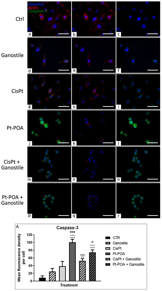 Double immunolabeling for caspase-3 (in green) and actin (in red) in controls (a–c) and differently treated U251 cells, i.e., after 48hr-CT using Ganostile 5 mg/mL (d–f), Cisplatin 40 μM (g–i), Pt(IV)Ac-POA 10 μM (j–l), Cisplatin + Ganostile (m–o), or Pt(IV)Ac-POA + Ganostile (p–r). DNA was stained with Hoechst 33258 (blue fluorescence). Magnification 40×; scale bar: 50 μm. (Panel A) Histogram showing the caspase-3 mean fluorescence intensity per cell (OD) in control and differently treated cells. * control vs. each experimental condition; ° Ganostile vs. other treatments; # Cisplatin vs. any combined treatment; ^ Pt(IV)Ac-POA vs. each combined treatment.