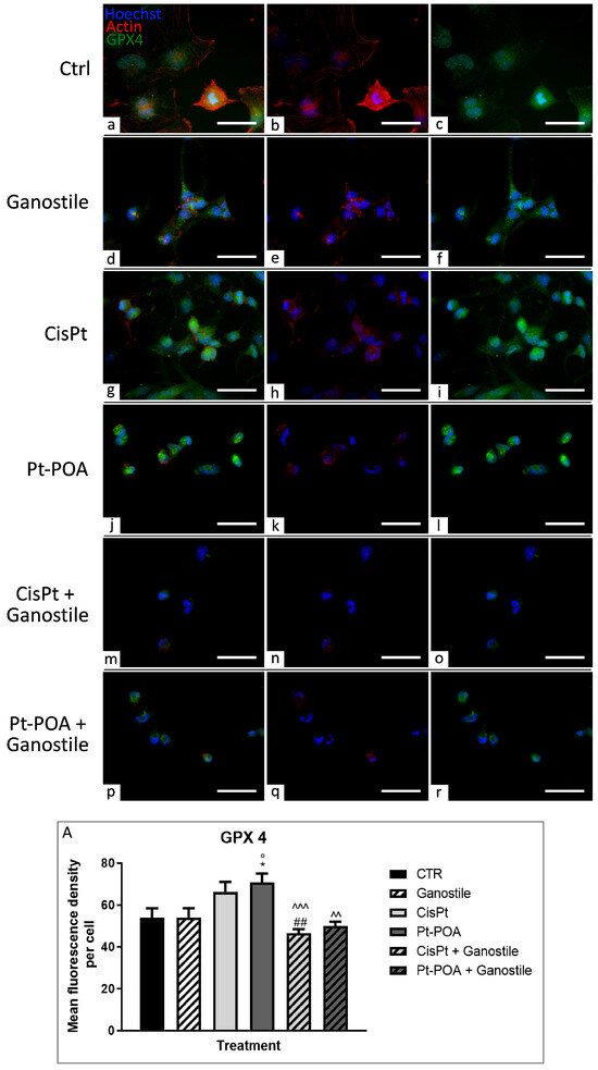 Double immunolabeling for GPX4 (in green) and actin (in red) in controls (a–c) and differently treated U251 cells, i.e., after 48hr-CT using Ganostile 5 mg/mL (d–f), Cisplatin 40 μM (g–i), Pt(IV)Ac-POA 10 μM (j–l), Cisplatin + Ganostile (m–o), or Pt(IV)Ac-POA + Ganostile (p–r). DNA was stained with Hoechst 33258 (blue fluorescence). Magnification 40×; scale bar: 50 μm. (Panel A) Histogram showing the GPX4 mean fluorescence intensity per cell (OD) in control and differently treated cells. * control vs. each experimental condition; ° Ganostile vs. other treatments; # Cisplatin vs. any combined treatment; ^ Pt(IV)Ac-POA vs. each combined treatment.