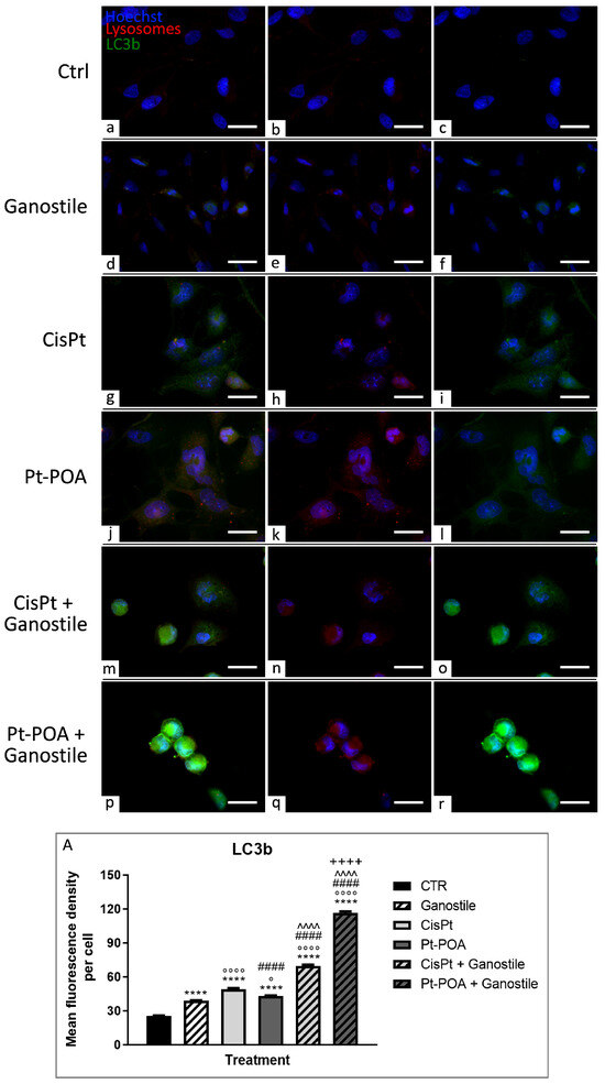 Double immunolabeling for LC3b (in green) and lysosomes (in red) in controls (a–c) and differently treated U251 cells, i.e., after 48hr-CT using Ganostile 5 mg/mL (d–f), Cisplatin 40 μM (g–i), Pt(IV)Ac-POA 10 μM (j–l), Cisplatin + Ganostile (m–o), or Pt(IV)Ac-POA + Ganostile (p–r). DNA was stained with Hoechst 33258 (blue fluorescence). Magnification 60×; scale bar: 25 μm. (Panel A) Histogram showing the LC3b mean fluorescence intensity per cell (OD) in control and differently treated cells. * control vs. each experimental condition; ° Ganostile vs. other treatments; # Cisplatin vs. any combined treatment; ^ Pt(IV)Ac-POA vs. each combined treatment; + Cisplatin + Ganostile vs. other experimental groups.
