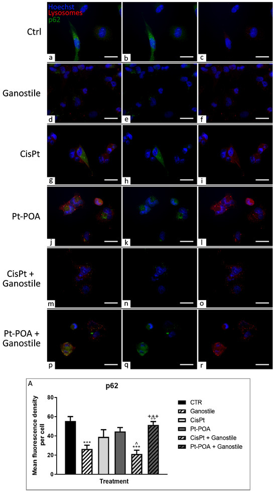 Similarly, the lysosomes were also homogeneously distributed and present with modest size and number. In samples treated with the Ganostile (d–f), an extremely statistically significant decrease in p62 immunopositive OD was observed (55.42 ± 4.69 and 26.46 ± 3.82 for Ctrl and Ganostile, respectively). Following treatment with Cisplatin 40 μM (g–i) or Pt(IV)Ac-POA 10 μM (j–l), the labeling for p62/SQSTM1 was intensely expressed (39.04 ± 7.33 and 44.52 ± 4.16, respectively) and, particularly after Pt(IV)Ac-POA, it colocalized with lysosome fluorescence, which increased their size and concentrated near the nucleus. When the samples were exposed to combined treatment of Cisplatin + Ganostile (m–o), a significant reduction in p62 immunofluorescence OD was noted (21.09 ± 4.03). However, after Pt(IV)Ac-POA + Ganostile (p–r) treatment, p62 expression levels remained comparable to the control (51.46 ± 3.44) (Figure 13, Panel A).