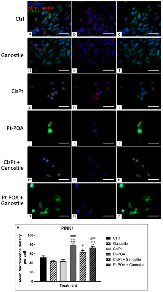 Immunoreaction for PINK1 is reported in Figure 14. After treatments with Ganostile (d–f) and Cisplatin (g–i), PINK1 immunofluorescence OD was comparable to the control (a–c) (43.41 ± 2.60, 43.81 ± 4.15, and 51.88 ± 3.44 for Ganostile, Cisplatin, and Ctrl, respectively). Only a slight increase in PINK1 OD was detected after Cisplatin + Ganostile (m–o) treatment (62.933 ± 4.151). The most significant effect was observed after exposure to Pt(IV)Ac-POA 10 μM (j–l) and its respective combined treatment with the supplement, i.e., Pt(IV)Ac-POA + Ganostile (p–r) (73.11 ± 3.25) (Figure 14, Panel A).