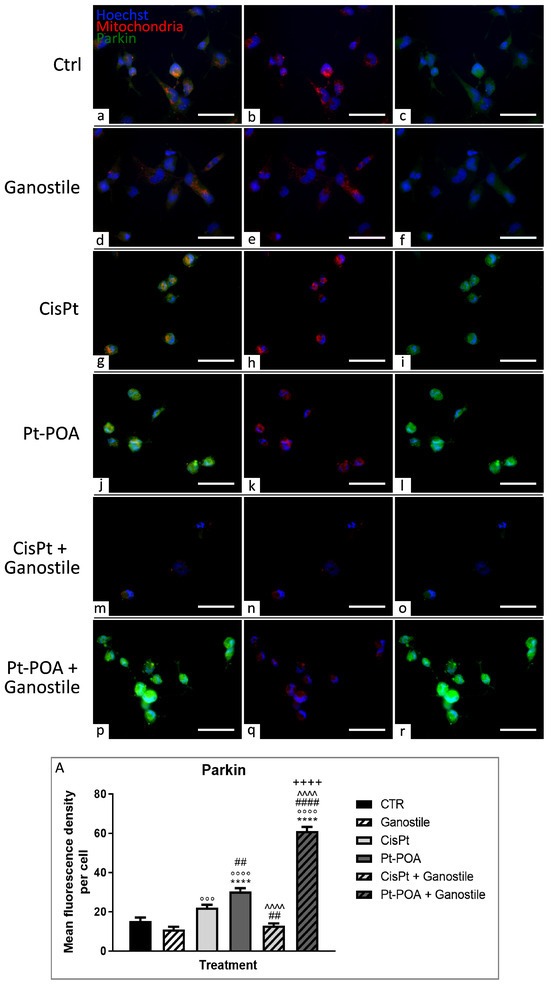 In particular, a significant increase in Parkin immunofluorescence OD was detected after Pt(IV)Ac-POA (j–l) or Pt(IV)Ac-POA + Ganostile (p–r) treatment (30.42 ± 1.68 and 61.14 ± 2.11, respectively) compared to other experimental groups (a–c, d–f, g–i, and m–o for control, Ganostile, Cisplatin 40 μM, and Cisplatin + Ganostile, respectively) (Figure 15, Panel A).