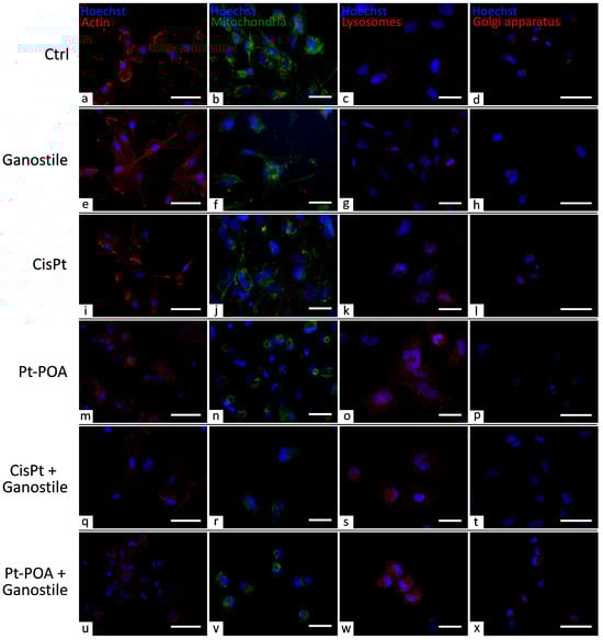 Immunolabeling for actin (a,e,i,m,q, and u, in red), mitochondria (b,f,j,n,r, and v, in green), lysosomes (c,g,k,o,s, and w, in red) and Golgi apparatus (d,h,l,p,t, and x, in red) in controls (a–d) and differently treated U251 cells, i.e., after 48hr-CT using Ganostile 5 mg/mL (e–h), Cisplatin 40 μM (i–l), Pt(IV)Ac-POA 10 μM (m–p), Cisplatin + Ganostile (q–t), or Pt(IV)Ac-POA + Ganostile (u–x). DNA was stained with Hoechst 33258 (blue fluorescence). Magnification 40×; scale bar: 50 μm (a,d,e,h,i,l,m,p,q,t,u, and x); 60×; scale bar: 25 μm (b,c,f,g,j,k,n,o,r,s,v, and w).