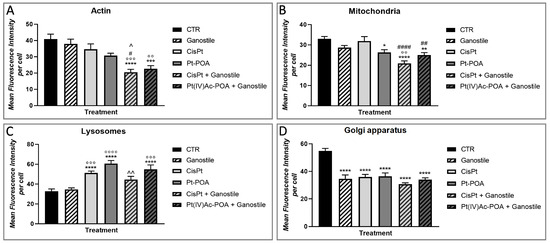 Histogram showing the (Panel A) actin, (Panel B) mitochondria, (Panel C) lysosomes, and (Panel D) Golgi apparatus mean fluorescence intensity per cell (OD) in control and differently treated cells. * control vs. each experimental condition; ° Ganostile vs. other treatments; # Cisplatin vs. any combined treatment; ^ Pt(IV)Ac-POA vs. each combined treatment.