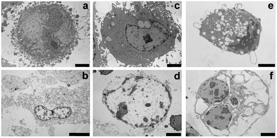 TEM ultrastructural analysis of control (a) and Ganostile 5 mg/mL (b), Cisplatin 40 μM (c), Cisplatin + Ganostile (d), Pt(IV)Ac-POA 10 μM (e), and Pt(IV)Ac-POA + Ganostile (f) treated cells. N: nucleus. Scale bar; 2 μm (a,c–f); 5 μm (b).