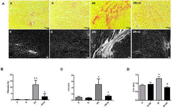 Progressive structural modifications associated with fibro-inflammatory motifs of the myocardium is a major characteristic feature of failing hearts [18,19]. We first investigated whether galanin affects I/R-induced myocardial fibro-inflammatory responses after myocardial damage in mice. An excessive accumulation of fibrillar collagen in the myocardium was detected in mice subjected to 14 days of I/R injury using Sirius Red staining and histomorphological examination by polarized light microscopy (Figure 1). In contrast, the galanin post-ischemic treatment markedly decreased myocardial fibrosis in I/R-challenged mice compared with vehicle-treated mice (Figure 1A,B). Consistent with these observations, in galanin-treated I/R mice, we found a significant decrease in the mRNA expression of collagen type I and type III in the heart (Figure 1C,D).