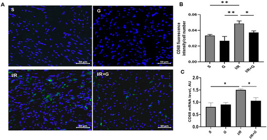 A recent report suggested that macrophages promote the transition from myocardial I/R injury to cardiac fibrosis in mice [20]. To evaluate the effects of galanin in macrophage-associated inflammatory responses to I/R injury, we next examined the myocardial expression of CD68, a macrophage marker, in vehicle- or galanin-treated I/R-challenged hearts. As shown in Figure 2A,B, I/R injury induced the expression of CD68 in cardiac tissue, demonstrating a high macrophage number in the damaged areas of the myocardium compared to the control sham group.