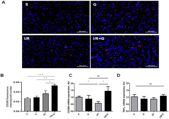 We next characterized M2-phenotype macrophages by studying the mRNA and protein abundance of CD206 in cardiac tissue from vehicle- or galanin-treated mice subjected to 14 days of I/R injury. The immunohistochemical staining showed no significant changes between the sham and I/R groups after 14 days of cardiac I/R injury (Figure 3A,B). However, we found that CD206 was highly expressed in cardiac sections from galanin-treated I/R mice compared to the vehicle-treated I/R group or sham mice (Figure 3A,B). A comparative analysis of mRNA expression levels demonstrated that I/R induces a down-regulation of the myocardial expression of CD206 compared to the control group, which was prevented by galanin treatment in mice (Figure 3C). In contrast, tumor necrosis factor α (TNFα) mRNA levels showed no significant differences between the experimental groups after 14 days of I/R injury compared to the vehicle-treated group (Figure 3D).