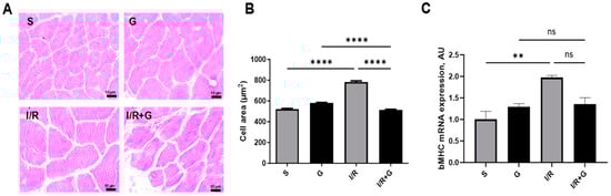 Galanin reduces cardiac hypertrophy in myocardial infarction reperfusion injury. (A) Representative photomicrographs of cardiac tissue sections with H&E staining and (B) quantitative analysis of the cross-sectional area. (C) Myocardial mRNA levels of β-MHC in vehicle- or galanin-treated control sham and I/R-challenged mice, n = 5. Data presented as the mean ± SEM; ns: not significant. ** p < 0.01, **** p < 0.001 according to one-way ANOVA followed by Bonferroni’s post hoc test.