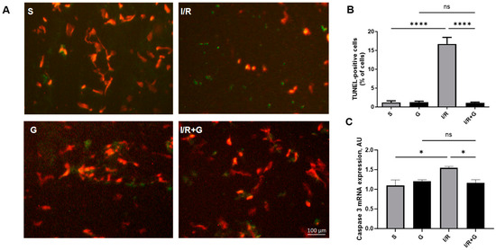 Animals were randomly divided into 4 groups: (1) sham + PBS (S) group (n = 5); (2) sham + galanin (G) group (n = 5); (3) ischemia/reperfusion + PBS (I/R) group (n = 5); and (4) ischemia/reperfusion + galanin (I/R + G) group (n = 5).