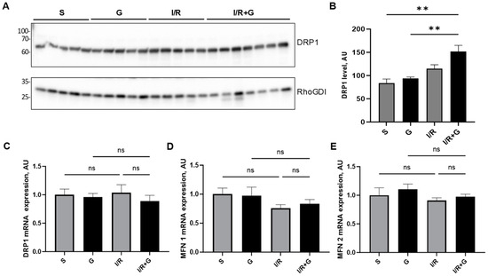 Mitochondria are dynamic organelles that continually undergo cycles of fission and fusion. To examine mitochondrial fission, we next evaluated the myocardial expression of dynamin-related protein 1 (DRP1) in cardiac tissue 14 days post-infarction. The cardiac DRP1 expression pattern showed no significant differences between the control sham and I/R groups (Figure 7A,B). In contrast, the treatment of mice with galanin increased DRP1 protein expression compared to the sham controls (Figure 7A,B). In addition to DRP1 myocardial expression, we evaluated the expression of mitofusin-1 (MFN1) and mitofusin-2 (MFN2), the arbitrators of mitochondrial fusion. The analysis of their mRNA expression levels demonstrated no significant differences in the mRNA expression of DRP1, MFN1, and MFN2 between the experimental groups (Figure 7C–E).