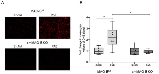 Increased ROS production in response to PAB was abrogated in cmMAO-B KO mice. Representative images (20× microscope’s magnification) of cryosections of RV tissue stained with dihydroethidium (DHE) dye from PAB- or SHAM-operated MAO-Bfl/fl and cmMAO-B KO mice (A). Quantification of ROS formation in RV tissue from MAO-Bfl/fl (SHAM and PAB n = 6 each) and cmMAO-B KO (SHAM and PAB n = 6 each) mice by measuring mean grey values of the DHE signal. Data are presented as mean fold change compared to MAO-Bfl/fl SHAM ± SD, * and #: p < 0.05 analyzed through two-side ANOVA (B).