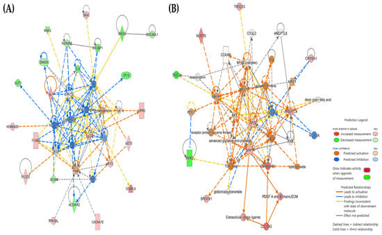 Gene interaction network map of each group. (A) Maternal group and (B) infant group. This network is composed of the top network, and was analyzed using the QIAGEN Ingenuity Pathway Analysis program.