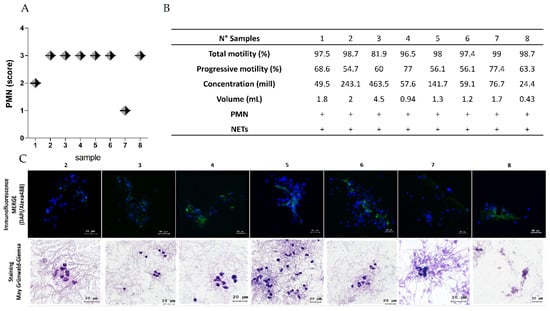 Characterization of dog semen samples. The chart in (A) shows the score determined for the presence of PMNs in each sperm sample, with 1 being scarce, 2 moderate, and 3 abundant. The table in (B) shows the results of the quality parameters of the semen sample. The images in (C) are representative of fluorescence microscopy and light microscopy observed with the 20× and 100× objective, respectively, showing PMNs infiltration and NET production (scale bars = 20 μm).