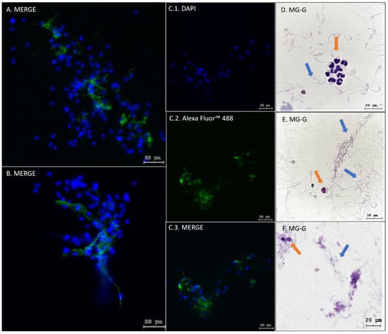 Representative immunofluorescence images show PMNs releasing NETs, and entrapped sperm present in dog semen samples by immunofluorescence. (A,B,C.3) MERGE indicates the co-location of both channels (DAPI and Alexa Fluor™ 488). (C.1) DAPI marker with blue fluorescence indicates nuclear sperm DNA and PMNs. (C.2) Alexa Fluor™ 488 marker with green fluorescence indicates NE from released NETs. (D–F) contains representative images of the May–Grünwald Giemsa stain, where the orange arrows indicate PMNs present in the samples and the blue arrows indicate sperm (scale bars = 20 μm).