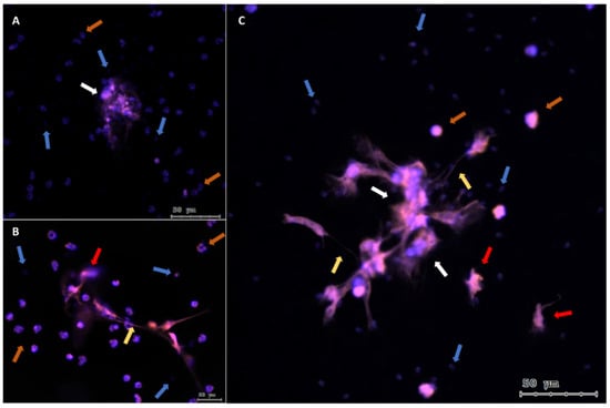Representative immunofluorescence images of dog PMN/sperm co-cultures. (A–C) show the colocalization of the DAPI and Sytox Orange markers and different phenotypes of NETs. Orange arrows indicate PMNs, blue arrows indicate sperm, white arrows indicate aggNETs, yellow arrows indicate sprNETs, and red arrows indicate diffNETs ((A,C), scale bar = 50 μm, (B), scale bars = 20 μm).