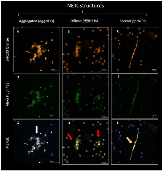 Representative images of the different NET phenotypes (aggNETs, sprNETs, and diffNETs) from PMNs stimulated with dog sperm. (A,D,G) The white arrow in (G) indicates the structure of aggNETs. In (B,E,H), the red arrows in (H) indicate diffNETs, and in (C,F,I), the yellow arrow in (I) indicates sprNETs. DNA can be observed with orange fluorescence in (A–C) (Sytox© Orange), and the presence of NE with green fluorescence (Alexa Fluor 488) in (D–I) shows co-location of both channels of extracellular structures attributable to NETs (scale bars = 20 μm).