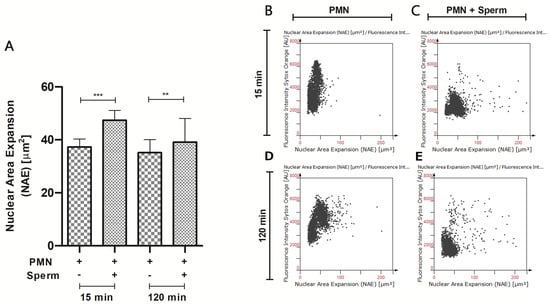Representative image of nuclear area expansion (NAE) of PMNs isolated from peripheral blood exposed to dog sperm. (A) NAE−based quantification of sperm-activated PMNs at 15 and 120 min of exposure with their respective controls. The letters (B–E) represent scatter plots of PMNs nuclear segmentation. p < 0.01, **, p < 0.0001, ***.