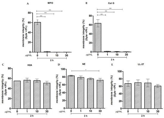 Effect of different concentrations of NET components on the cell membrane integrity of dog sperm. (A) Myeloperoxidase (MPO); (B) Cathepsin G (Cat G); (C) Histone 2 A (H2A), (D) Neutrophil elastase (NE), and (E) Cathelicidin (LL-37). The results are shown as mean ± standard deviation. The asterisks on the bar indicate differences in the three biological replicates compared to the control for MPO p < 0.02, *** (A); Cat-G p < 0.0001 *** (B), NE p < 0.05, * (D).