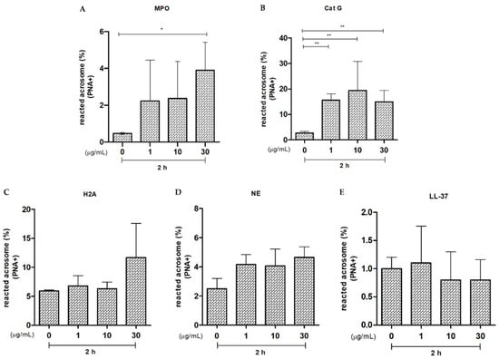 Effect of different concentrations of NET components on the state of the acrosome in dog sperm. (A) Myeloperoxidase (MPO); (B) Cathepsin G (Cat G); (C) Histone 2A (H2A), (D) Neutrophil elastase (NE), and (E) Cathelicidin (LL-37). The results are shown as mean ± standard deviation. The asterisks on the bar indicate differences in the three biological replicates compared to the control. For MPO p < 0.02, * (A); Cat-G p < 0.01 ** (B).