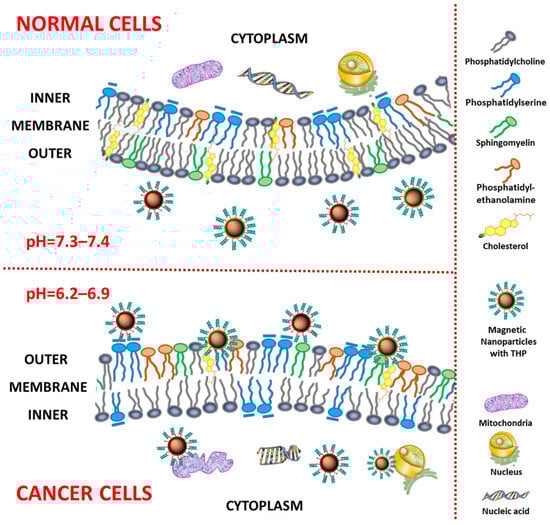 Cell membranes in cancer and healthy cells exhibit distinct properties (Figure 1). Membrane attributes favor or inhibit drug penetration, conformation, and location, thus affecting therapeutic targets. Healthy cell membranes possess the asymmetric distribution of sphingomyelin and phosphatidylcholine in the outer leaflets and anionic phosphatidylserine and phosphatidylethanolamine in the inner leaflets [], whereas in the cancer cell membrane, this asymmetric distribution and alterations in membrane fluidity are lost, which results in negative-charge phosphatidylserine exposure on the surface of the membrane, with the location of phosphatidylethanolamine on the outer leaflet [,]. Moreover, sphingomyelin is reduced in the cancer cell membrane, which is also associated with tumorigenesis []. Different lipid composition affects membrane fluidity, impacting drug penetration and biological action [,,].