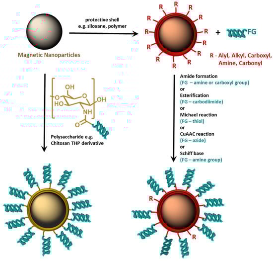 In the literature, several THP conjugation approaches to magnetic nanoparticles are implemented (Figure 3). Most of them are based on MNP coating with a biocompatible shell (PEGs, polysaccharides), followed by a reaction with the peptide or peptide derivative. The reactions most commonly used to anchor THPs onto nanoparticle surfaces are