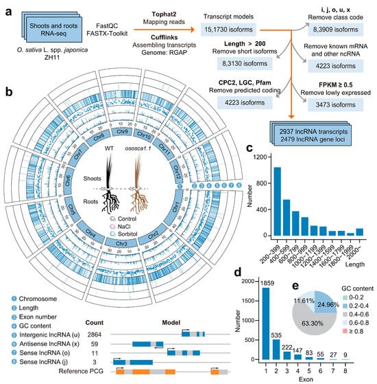 To comprehensively pinpoint lncRNAs involved in the processes induced by OsOSCA1.1, salt, and hyperosmolarity stress in rice, we conducted lncRNA identification based on 24 RNA-seq data sets []. It contained the seedling roots of ZH11 and ososca1.1 exposed to the solution (hyperosmolarity stress, salt stress, and control) and their corresponding shoots []. After completing the general transcriptome analysis, a total of 151,730 transcript models were eligible to proceed to the subsequent lncRNA screening pipeline. Combining the length, coding potential, expression level, and other properties of transcripts, 2937 isoforms (2479 loci) were considered acceptable lncRNAs (Figure 1 and Table S1). A lncRNA transcriptome-wide profile of rice seedlings depicted the basic characteristics and chromosomal distribution (Figure 1b). LncRNA was widely distributed on the 12 chromosomes of rice, and intergenic lncRNA (lincRNA) was the most dominant type (97.51%) (Figure 1b). Other types of lncRNA were relatively rare, including 59 antisense lncRNAs (lncNATs) and 14 sense lncRNAs (11 transcripts considered as generic exonic overlap with a reference transcript, and three isoforms considered as potential novel transcripts). A series of intergenic non-coding transcripts in rice seedlings have been completely ignored. For the length, most lncRNAs (average length of 729 nt) were comparatively short: 77.83% of transcripts were shorter than 1000 nt, and only 4.09% of lncRNAs exceeded 2000 nucleotides (Figure 1c). Additionally, a significant proportion of lncRNAs were found to have no more than two exons, with fewer lncRNAs containing a higher number of exons (Figure 1d). In terms of GC content, lncRNAs displayed a wide spectrum of variability (from 0.196 to 0.816), with an average value of 0.471. The average GC content of lncRNA was higher than that of the whole rice genome (0.436). This result was consistent with the conclusions of previous lncRNA-related identification work in plants. More than half (63.36%) of the lncRNAs had GC content concentrated between 0.4 and 0.6 (Figure 1e). Therefore, a series of basic statuses of lncRNAs in rice seedlings could also be generally regarded as the characteristics of lincRNAs.