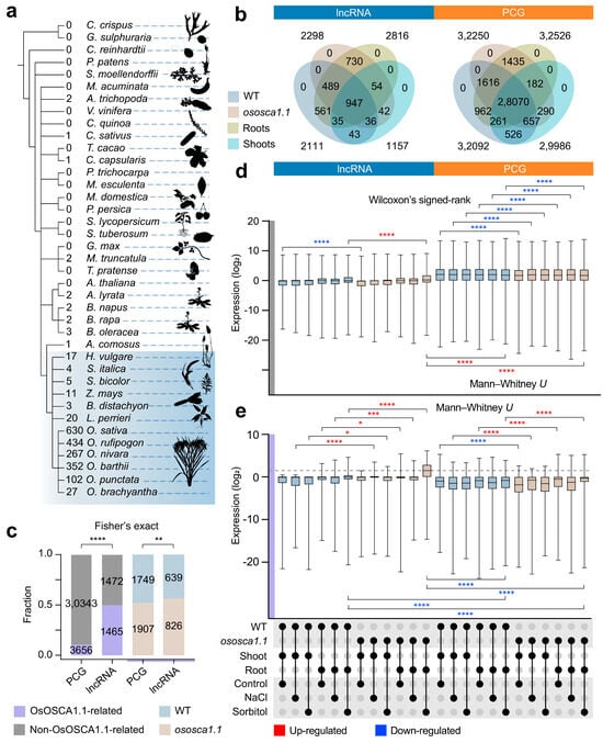 The lncRNA conservation pattern and expression of OsOSCA1.1-related lncRNAs in rice seedlings. (a) Phylogenetic distribution of conversed lncRNAs. Sequence conservation of lncRNAs (ZH11 and ososca1.1) and other species in CANTATAdb (n = 39, containing O. sativa). The counts represent the number of homologs lncRNAs. The images of the different species are from PhyloPic (https://www.phylopic.org/, accessed on 29 April 2024). (b) Comparison among members of lncRNAs (n = 2937) and PCGs (n = 33,999) in WT, ososca1.1, roots, and shoots. (c) Fraction of OsOSCA1.1-related and non-OsOSCA1.1-related lncRNAs and PCGs. (d) Expression of non-OsOSCA1.1-related lncRNAs (n = 1472) and PCGs (n = 30,343). (e) Expression of OsOSCA1.1-related lncRNAs (n = 1465) and PCGs (n = 3656). Expression levels in each sample are computed in log (FPKM)2 units. (*: p < 0.05, **: p < 0.01, ***: p < 0.001, ****: p < 0.0001, two-sided Mann–Whitney U test, two-sided Fisher’s exact test).