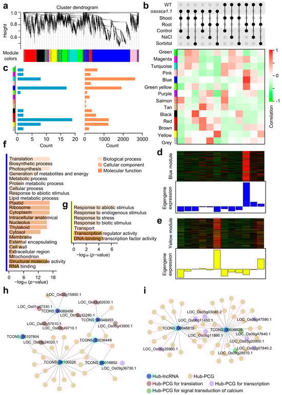 Co-expression network of trans-regulated lncRNAs and their PCGs in rice seedlings associated with OsOSCA1.1 and hyperosmolality stress. (a) Hierarchical cluster tree and color bands showing the 14 modules by WGCNA (n = 10,000). (b) Module–trait correlation analysis. (c) Number of lncRNAs and PCGs in each module. (d) Eigengene expression profile for the “Blue” module in WT roots (n = 1930). (e) Eigengene expression profile for the “Yellow” module in rice roots treated with hyperosmolality stress (n = 1240). (f,g) Enriched GO terms among PCGs and their trans-regulated lncRNAs of the “Blue” module and “Yellow” module. (h,i) Co-expression trans-regulated network of the “Blue” module (weight threshold = 0.4) and “Yellow” module (weight threshold = 0.25). Hub-lncRNAs and Hub-PCGs are represented in blue and orange, respectively, among which PCGs related to translation, transcription, and signaling transduction of calcium functions are highlighted.
