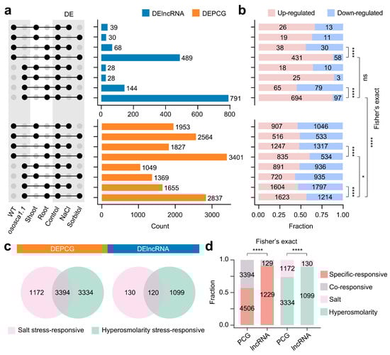 Comparison of different stress-responsive lncRNAs and PCGs. (a) Number of DElncRNAs and DEPCGs in response to NaCl or sorbitol in the shoots and roots. (b) Fraction of up-regulated and down-regulated DElncRNAs and DEPCGs in rice seedlings. (c) Co-responsive (both salt and hyperosmolarity stress-responsive) DElncRNAs and DEPCGs. (d) Fraction of salt stress-responsive and hyperosmolarity stress-responsive lncRNAs and PCGs. (*: p < 0.05, ****: p < 0.0001, two-sided Fisher’s exact test).